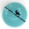 This bowl features our crow on a branch, screen printed in black enamel onto robin's egg blue glass, layered with clear glass. Large bowls are about 13" x 3" deep.