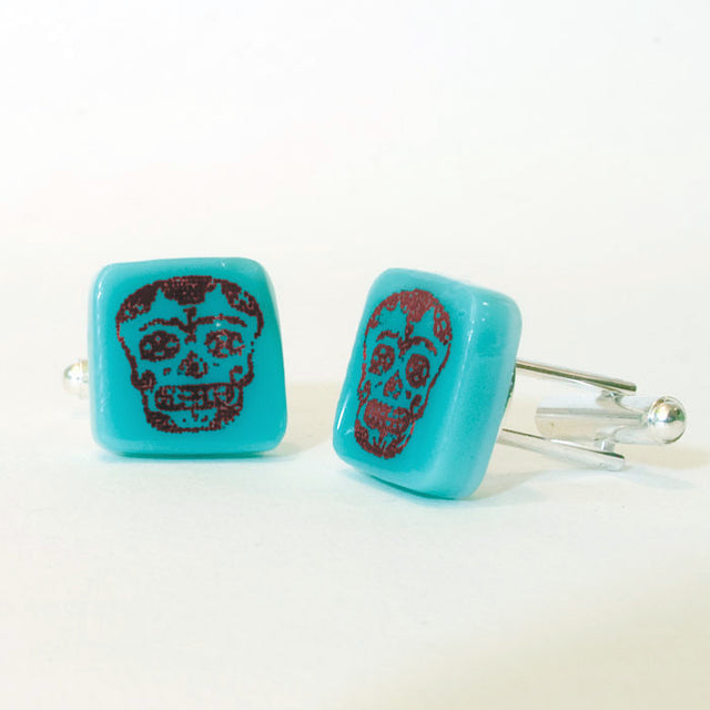 Fused glass cufflinks. Calavera screen printed with red enamel onto turquoise glass, then fused. Cufflinks are approximately 5/8" square and 1/4" thick, making them very durable. Finished pieces are glued to silver-plated cufflink hardware.