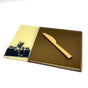 This cheese plate features a vintage Leica camera screen printed in black enamel onto a section of opaque ivory glass with a larger section of transparent light bronze glass, then fused in a kiln to about 1400 degrees.