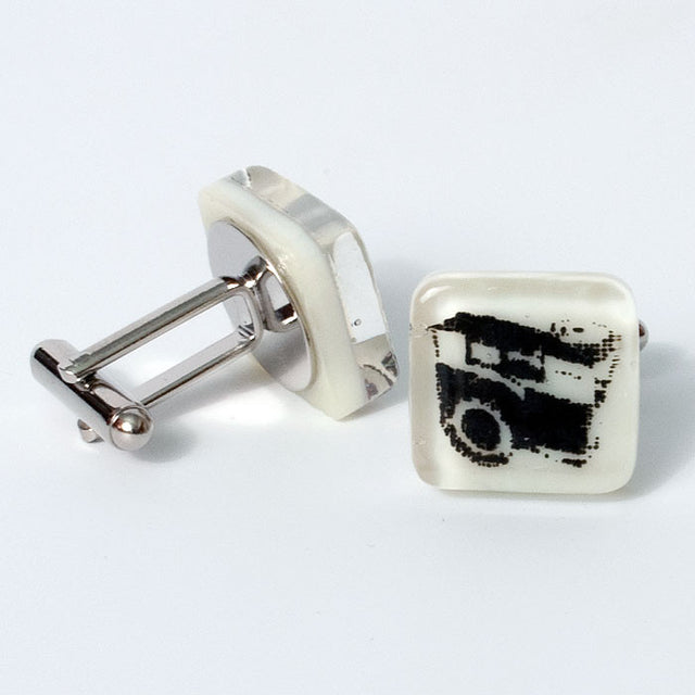 Fused glass cufflinks. Vintage camera is screen printed with black enamel onto ivory glass, then fused. Cufflinks are approximately 5/8" square and 1/4" thick, making them very durable. Finished pieces are glued to silver-plated cufflink hardware.