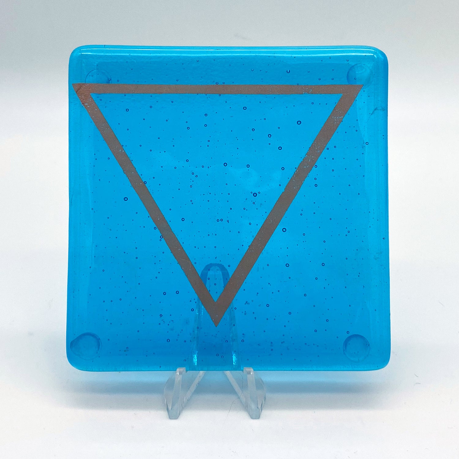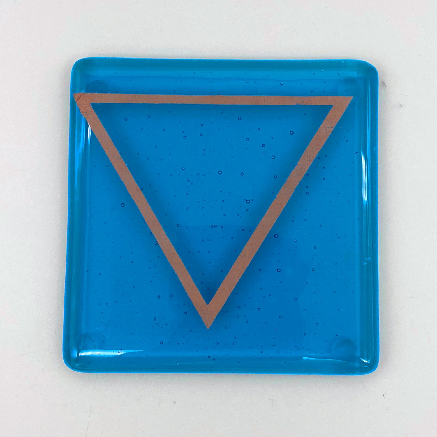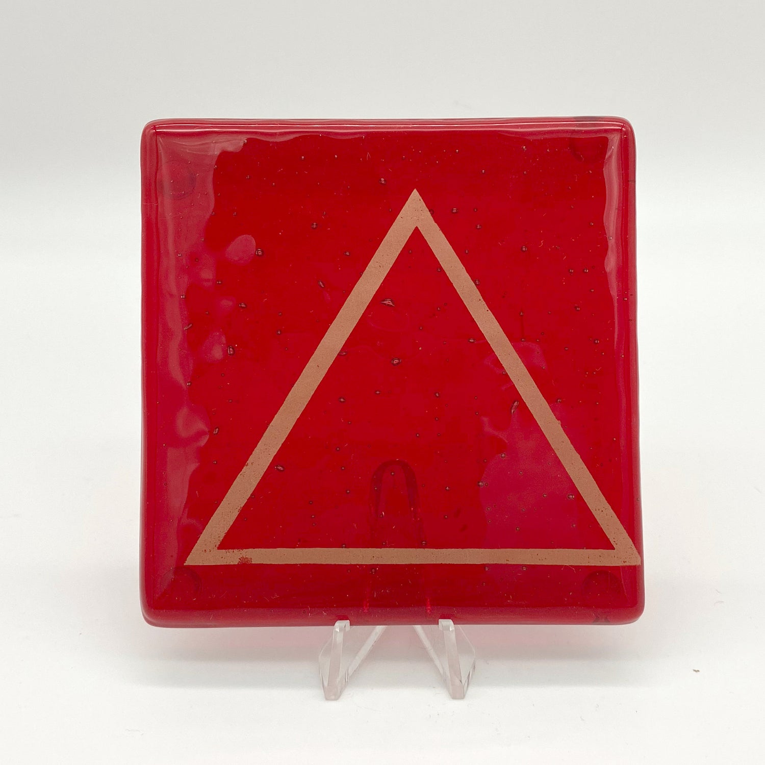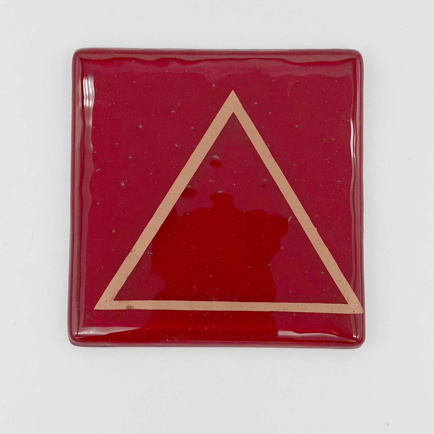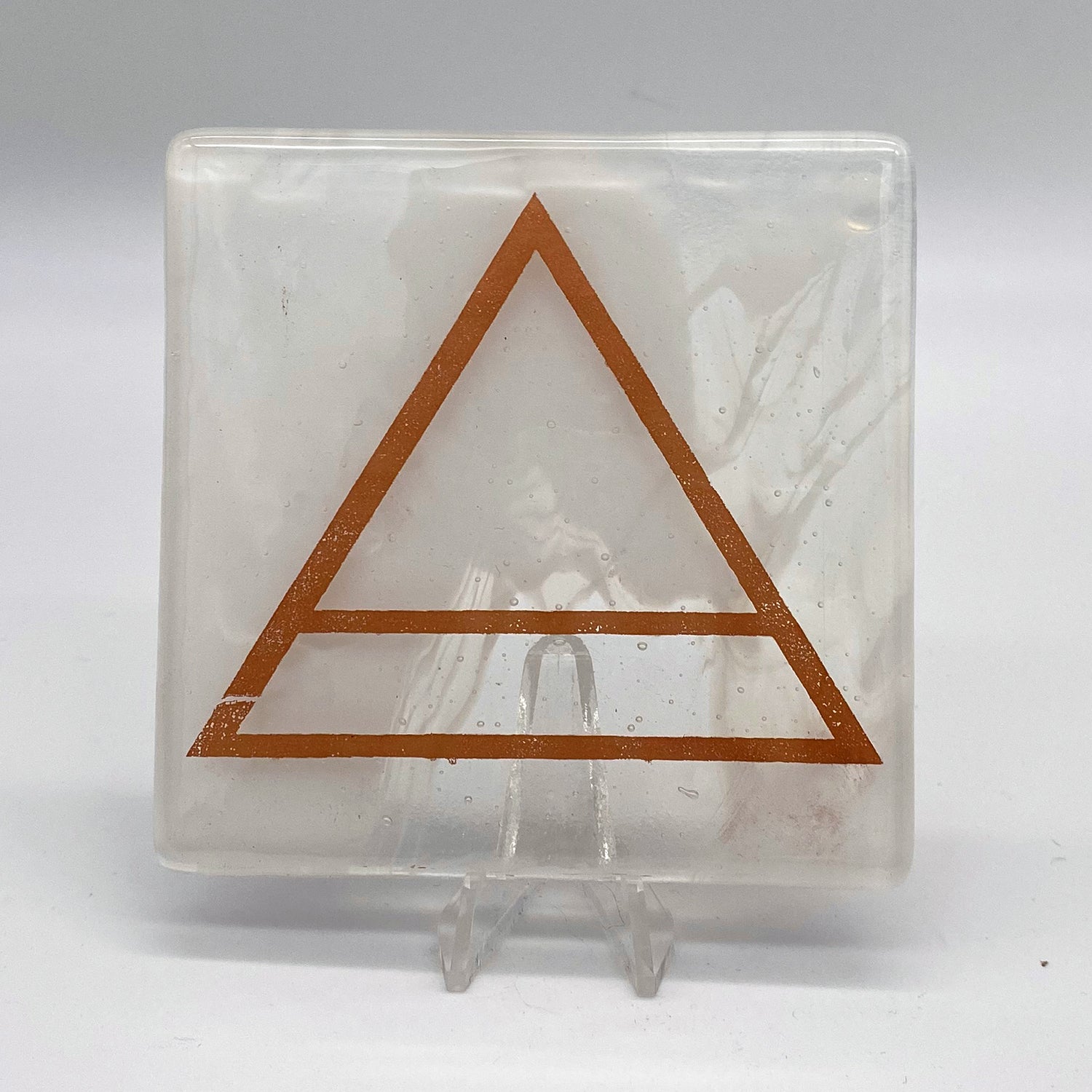 4x4" kiln formed glass coaster set of four. This set features the four element icons screen printed with sparkly copper mica onto transparent wispy clear-white, turquoise, red and fern green glass, then fused in a kiln to about 1400 degrees. Each coaster has clear bumpers on the bottom to protect your surfaces.