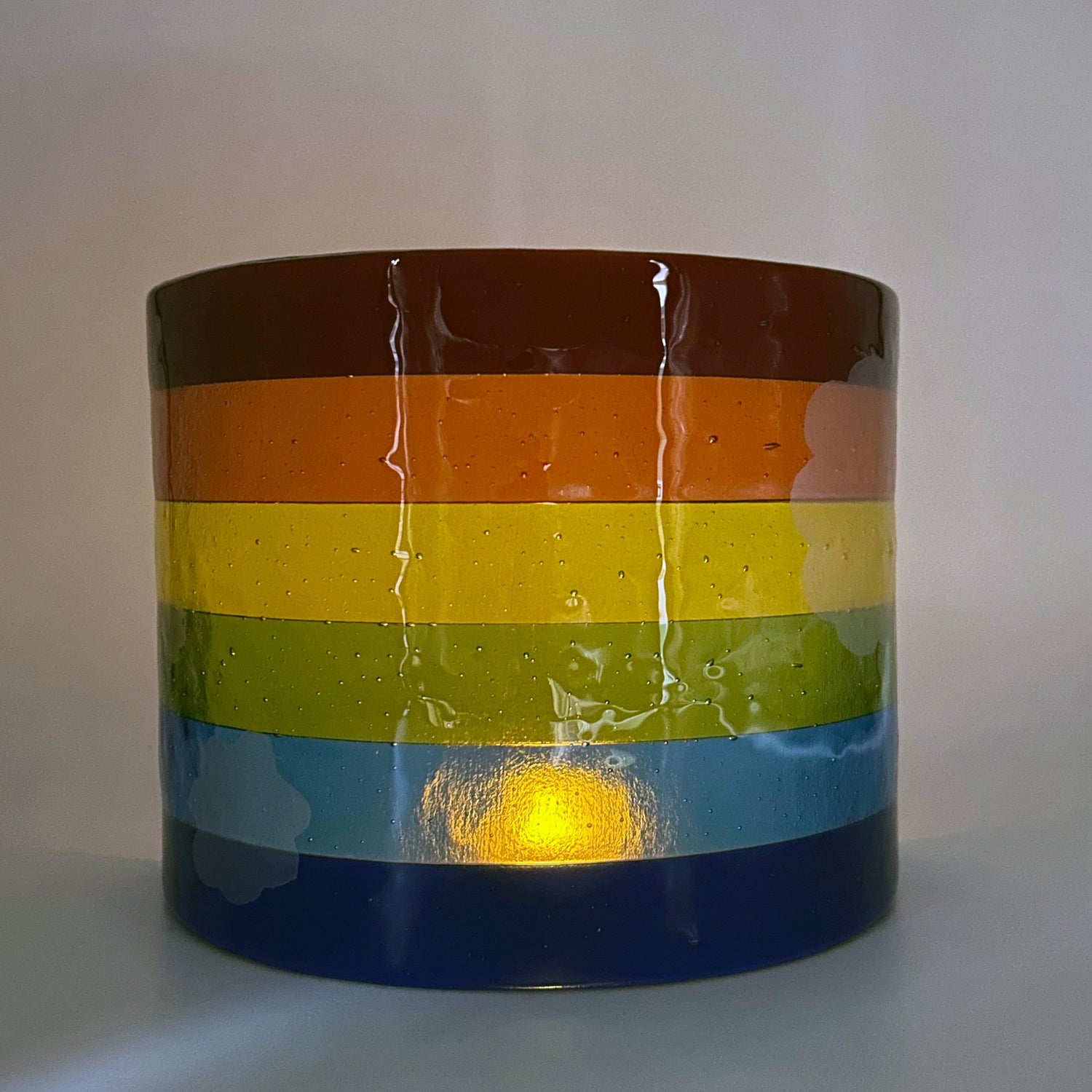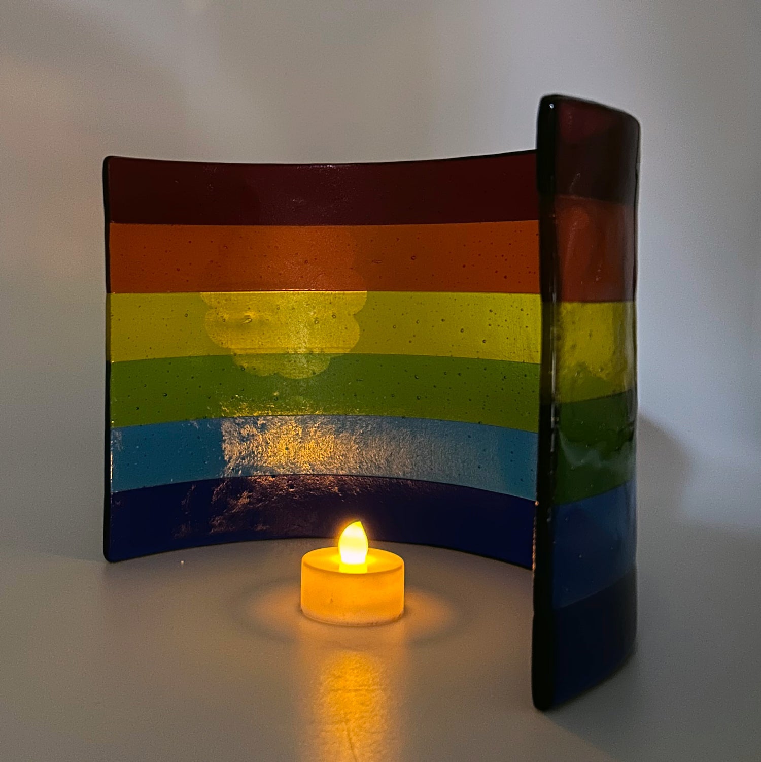 Rainbow Bridges are made with several transparent colors of glass, screen printed with sparkle white mica, then fused in a kiln. Flat pieces are cold worked to clean up edges, then returned to the kiln to drape over a stainless steel mold, creating their final shape.