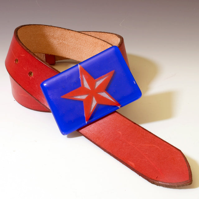 Nautical star screen printed with red and white enamels onto cobalt blue glass, then fused in a kiln to about 1400 degrees. Steel buckle back affixed to the back. Approx. 2.25" x 3.5", will fit up to a 1 3/4 " wide belt (sold separately).