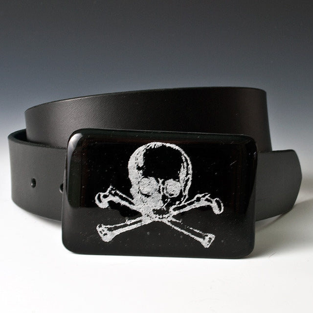 Skull and crossbones screen printed with white enamel onto black glass, then fused in a kiln to about 1400 degrees. Steel buckle back affixed to the back. Approx. 2.25" x 3.5", will fit up to a 1 3/4 " wide belt (sold separately).