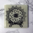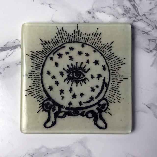 4x4" kiln formed glass coaster single coaster. This coaster features one of our Witchy coasters, the crystal ball, screen printed with black enamel onto opaque ivory glass, then fused in a kiln to about 1400 degrees. Each coaster has clear bumpers on the bottom to protect your surfaces.