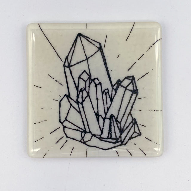 4x4" kiln formed glass coaster. This coaster features our crystals drawing, screen printed in black enamel onto opaque ivory glass, then fused in a kiln to about 1400 degrees. Each coaster has clear bumpers on the bottom to protect your surfaces.