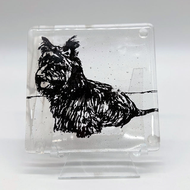 4x4" screen printed, kilnformed glass coaster. This coaster features the Roosevelt dog, Fala, printed with black enamel onto wispy clear-white glass, then fused in a kiln to about 1400 degrees. Each coaster has clear bumpers on the bottom to protect your surfaces.