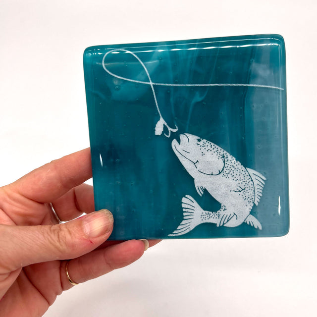 4x4" kiln formed glass single coaster. This coaster features a fish and line screen printed with white enamel onto wispy peacock blue-white glass, then fused to about 1400 degrees in a kiln. Please note that the wispy glass is somewhat one-of-a-kind, and will differ slightly from what's pictured.