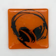 4x4" kiln formed glass coaster. This coaster features retro headphones screen printed in black enamel onto orange glass, then fused in a kiln to about 1400 degrees. Each coaster has clear bumpers on the bottom to protect your surfaces.