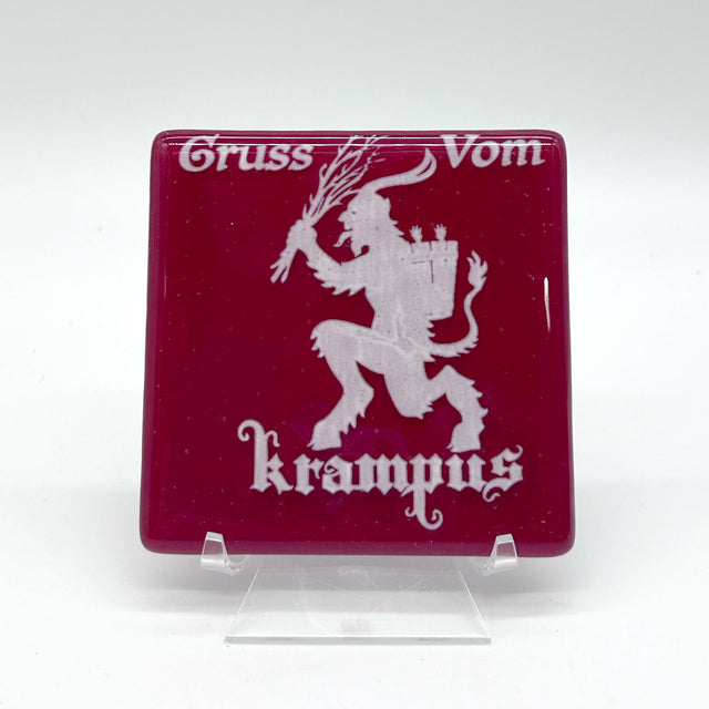 4x4" kiln formed glass single coaster. This design features a vintage Krampus* design screen printed with white enamel onto deep red glass, then fused in a kiln to about 1400 degrees. Each coaster has clear bumpers on the bottom to protect your surfaces.