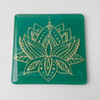 4x4" kiln formed glass coaster. This coaster features our lotus drawing screen printed in gold mica onto jade green glass, then fused in a kiln to about 1400 degrees. Each coaster has clear bumpers on the bottom to protect your surfaces.