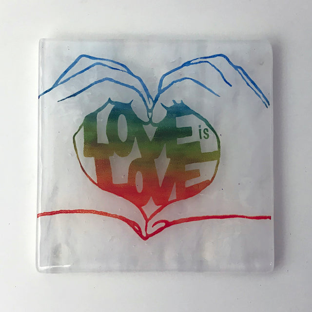 4x4" kiln formed glass coaster. This coaster features our Love is Love design screen printed with rainbow enamels onto wispy white glass, then fused in a kiln to about 1400 degrees. Each coaster has clear bumpers on the bottom to protect your surfaces.