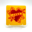 4x4" fused glass single coaster. This design features a LOVE tattoo design, screen printed with red enamel onto yellow glass, then fused in a kiln to about 1400 degrees. Each coaster has clear bumpers on the bottom to protect your surfaces.