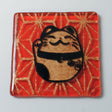 4x4" kiln formed glass coaster. This coaster features our lucky cat "Maneki Neko" screen printed in black enamel over a Japanese geometric design, printed in gold mica, onto transparent red-orange glass, then fused in a kiln to about 1400 degrees. Each coaster has clear bumpers on the bottom to protect your surfaces.