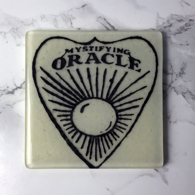 4x4" kiln formed glass coaster single coaster. This coaster features one of our Witchy coasters, the Ouija planchette, screen printed with black enamel onto opaque ivory glass, then fused in a kiln to about 1400 degrees. Each coaster has clear bumpers on the bottom to protect your surfaces.