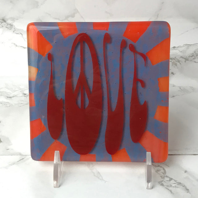 This coaster features our Summer of Love inspired Peace/Love screen printed in blue and red enamels onto wispy orange-white glass, then fused in a kiln to about 1400 degrees. Glass is then cold worked, returned to the kiln to slump into final shape to about 1250 degrees.