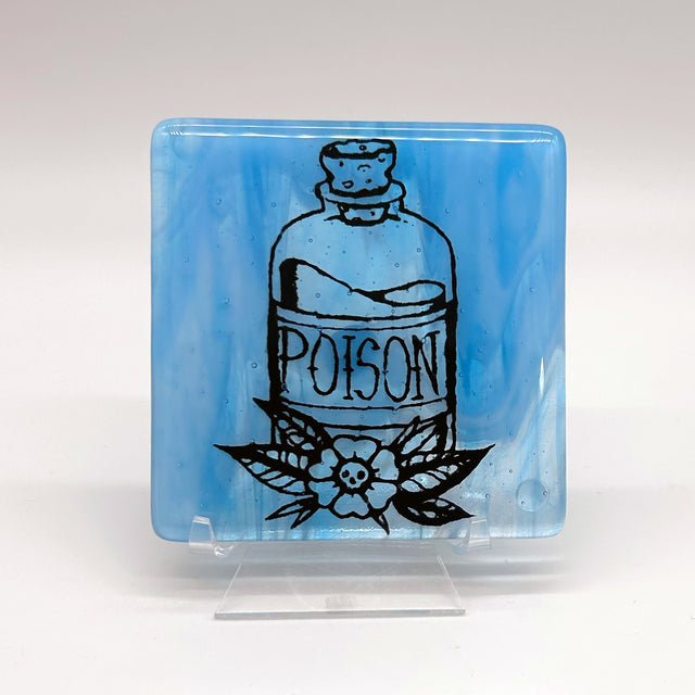 4x4" fused glass single coaster. This design features a poison tattoo design, screen printed with black enamel onto wispy turquoise glass, then fused in a kiln to about 1400 degrees. Each coaster has clear bumpers on the bottom to protect your surfaces.