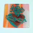 4x4" kiln formed glass coaster. This coaster features our Sacred Heart drawing screen printed with red and teal enamels onto wispy orange-white glass, then fused in a kiln to about 1400 degrees. Each coaster has clear bumpers on the bottom to protect your surfaces.