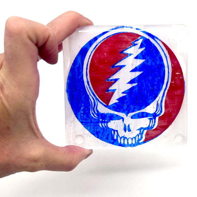 4x4" kiln formed glass coaster. Multi-functional little art pieces make great gifts! This coaster features the iconic Grateful Dead's Steal Your Face design. This design is perfect for Deadheads!