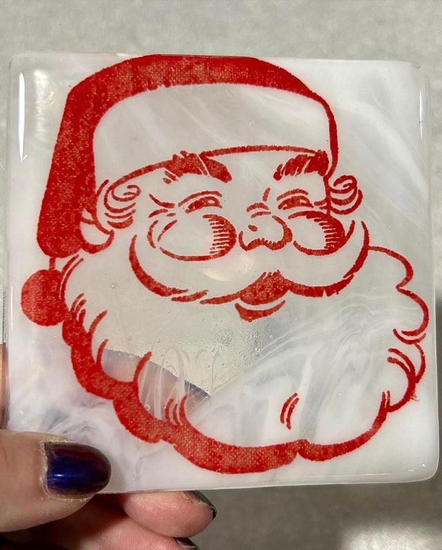 4x4" kiln formed glass coaster single coaster. This coaster features a vintage image of Santa screen printed with red enamel onto white wispy glass, then fused in a kiln to about 1400 degrees. Each coaster has clear bumpers on the bottom to protect your surfaces.