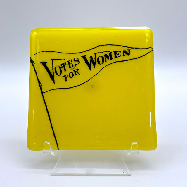 4x4" screen printed, kilnformed glass coaster. This coaster features a Votes for Women pennant screen printed with blue-violet enamel onto yellow glass, then fused in a kiln to about 1400 degrees. Each coaster has clear bumpers on the bottom to protect your surfaces.