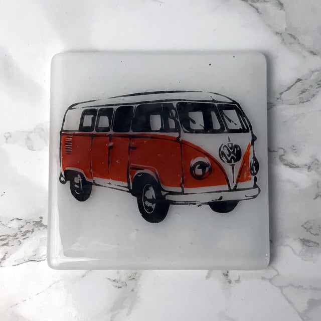 4x4" kiln formed glass coaster. This coaster features a VW van screen printed with black and orange enamels onto white glass, then fused in a kiln to about 1400 degrees. Each coaster has clear bumpers on the bottom to protect your surfaces.