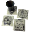 4x4" kiln formed glass coaster set of four. This set features our Witchy series - Ouija planchette, crystal ball, tarot card featuring the goddess moons, and palm reading chart, screen printed with black enamel onto opaque ivory glass, then fused in a kiln to about 1400 degrees. Each coaster has clear bumpers on the bottom to protect your surfaces.