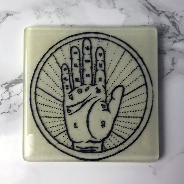 4x4" kiln formed glass coaster single coaster. This coaster features one of our Witchy coasters, Palmistry, screen printed with black enamel onto opaque ivory glass, then fused in a kiln to about 1400 degrees. Each coaster has clear bumpers on the bottom to protect your surfaces.