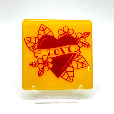 LOVE Tattoo 4" Handmade Fused Glass Bar Coaster