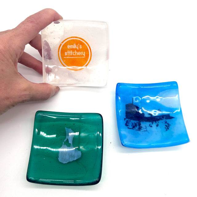 Dishes are printed with fine enamels onto colorful sheet glass, then fused it in a kiln to about 1400 degrees. They are then cold worked on a glass saw and/or grinder, then returned to the kiln to slump into it's final shape. They are screen printed, kiln formed glass, 2.75" square and slumped into a sushi-style mold making the about 3/4" high at the corners.