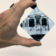 Fun and bright 2.25" square ornaments, not to heavy for your branches and cute as buttons. This ornament features a Chicago el train, screen printed in black enamel onto transparent light sapphire blue glass, and is then fused in a kiln to about 1400 degrees.