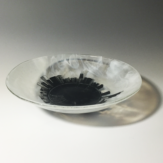 Large, wispy bowls are printed with your favorite city skyline, then fused in a kiln to about 1400 degrees. Bowls are then cold worked on grinders and saws, then put back into the kiln to slump into their final shape. Each bowl is unique and made-to-order, please allow an additional 2-4 weeks to make and ship.