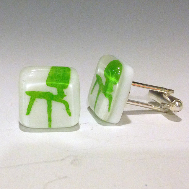 Fused glass cufflinks. Mod Eames Chair is screen printed with green enamel onto white glass, then fused. Cufflinks are approximately 5/8" square and 1/4" thick, making them very durable. Finished pieces are glued to silver-plated cufflink hardware.