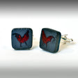 Fused glass cufflinks. Rooster is screen printed with red enamel onto silvery steel-blue glass, then fused. Cufflinks are approximately 5/8" square and 1/4" thick, making them very durable. Finished pieces are glued to silver-plated cufflink hardware.