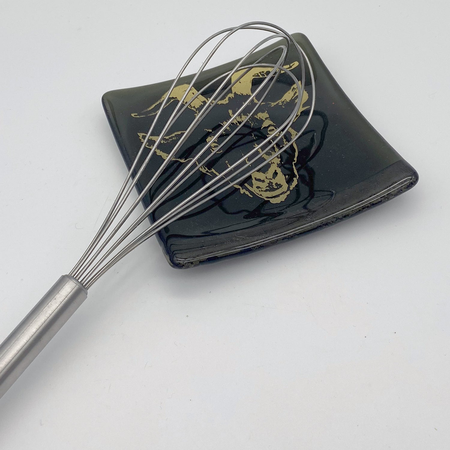 This dish is screen printed, kiln formed glass, 4.5" square and about 1/4" thick, slumped into a sushi-style mold making it about 3/4" high at the corners. Catch-alls are great for tossing your coins and keys into, hold rings and earrings, candles, soap, make cute appetizer plates, great spoon rests and decorative accents. We recommend hand washing, though they can go in the dishwasher (we like the China cycle for glass).