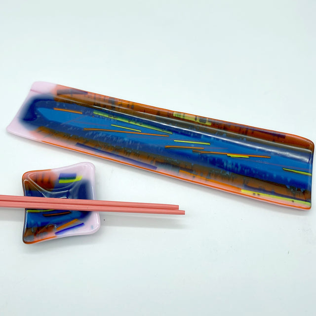 One of a kind "Smooshed Glass" aka "Glass Under Pressure" pieces that I've been experimenting with all spring! Glass is loaded, stacked, in the kiln with weights on top, and as the heat goes higher, the weights push down on the glass, resulting in thinner pieces with amazing color reactions. Sushi dishes are about 14" long x 3 1/2" wide and about 1/4" high at the corners, and accompanying sauce dishes (if any) are about 3" square x 1" high. All sushi platters come with chopsticks as pictured.