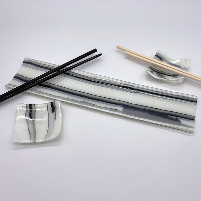 This solo sushi platter is made with a beautiful neutral color palette of "reactive colors" (colors that contain elements that cause a reaction when they touch) of dense white, french vanilla and deep charcoal stripes. It is dishwasher safe, but we recommend hand washing due to the thinner nature of the glass.