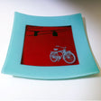 This platter has a section of transparent red glass bordered on all sides by opaque turquoise glass, and features a vintage Cruiser bike and power lines printed in light turquoise blue and black enamels, then fused in a kiln to about 1400 degrees. The fused piece is cold worked on glass saws and grinders, then returned to the kiln to slump into it's final shape. It is screen printed, kiln formed glass, 12" square, about 1/4" thick and slumped into a sushi-style mold, making it about 2" high at the corners.