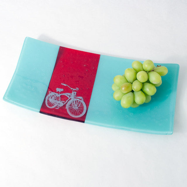 This platter features a vintage Schwinn cruiser bike screen printed in blue enamel onto transparent red glass, bordered by opaque turquoise glass, then fused in a kiln to about 1400 degrees. It is then cold worked on wet saws and grinders, then returned to the kiln to slump into a mold to about 1250 degrees.