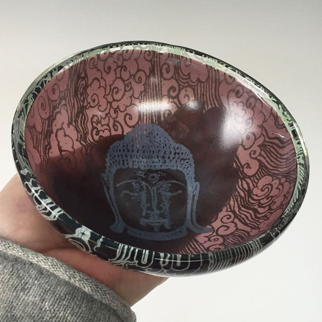 This small bowl features a serene buddha screen printed with light grape-purple enamel layered over a Japanese cloud design, printed in mint green enamel, onto transparent plum glass, then fused in a kiln to about 1400 degrees. Glass is then cold worked, returned to the kiln to drape into final shape at about 1250 degrees.