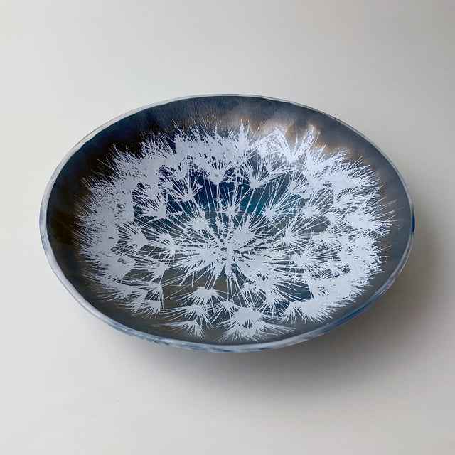 This bowl features our dandelion seed head design, screen printed in white enamel onto silvery steel blue glass, layered with a wispy white-clear glass. Large bowls are about 13" x 3" deep.