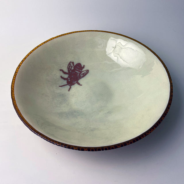 This bowl features our honeybee design, screen printed in copper mica onto a ivory glass, with the bottom layer printed in ivory enamel onto transparent honey colored amber glass. Large bowls are about 13" x 3" deep.