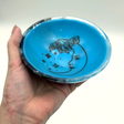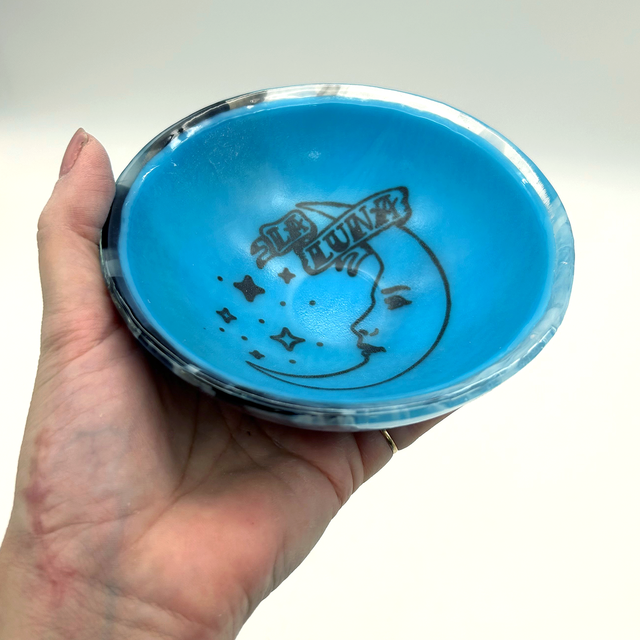 This small bowl features our loteria-inspired la luna drawing screen printed in black enamel onto cyan glass, backed with wispy white-clear-black glass, then fused in a kiln to about 1400 degrees. Glass is then cold worked, returned to the kiln to drape into final shape at about 1250 degrees.