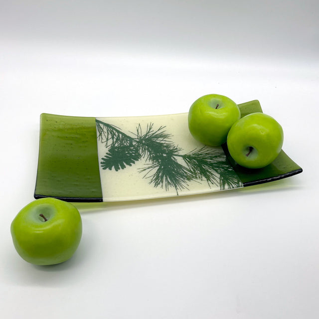 This platter features our pine bough and pine cone designscreen printed in dark green enamel onto ivory glass, flanked with fern green glass, then fused in a kiln to about 1400 degrees. It is then cold worked on wet saws and grinders, then returned to the kiln to slump into a mold to almost 1250 degrees.